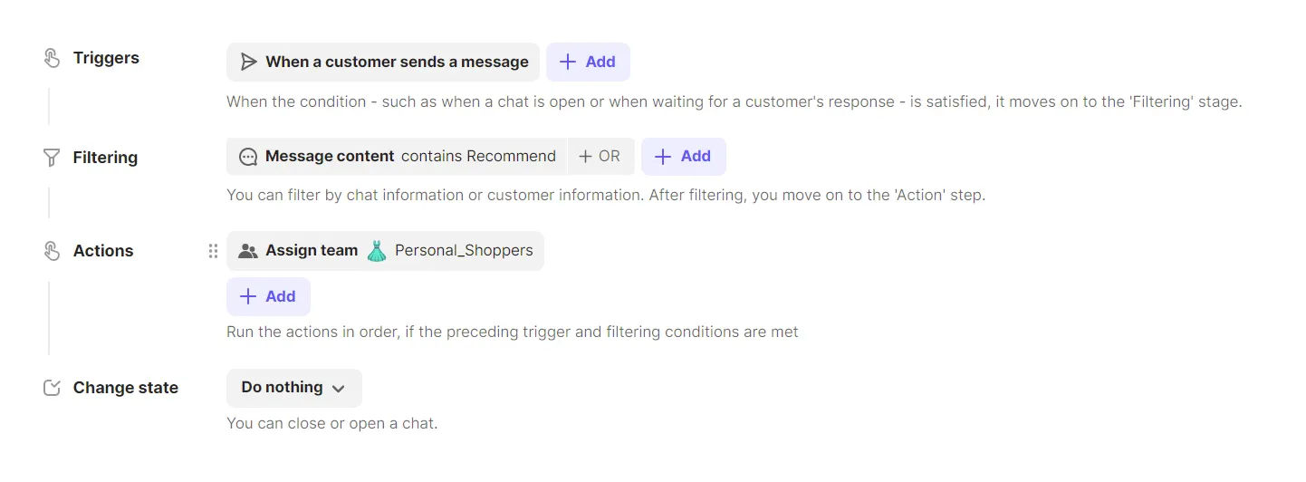 By setting a chat automation rule, you can assign a ‘Personal Shoppers’ team to a chat when the message contains the word ‘recommendation’ ([→ Learn more about chat automation rules])