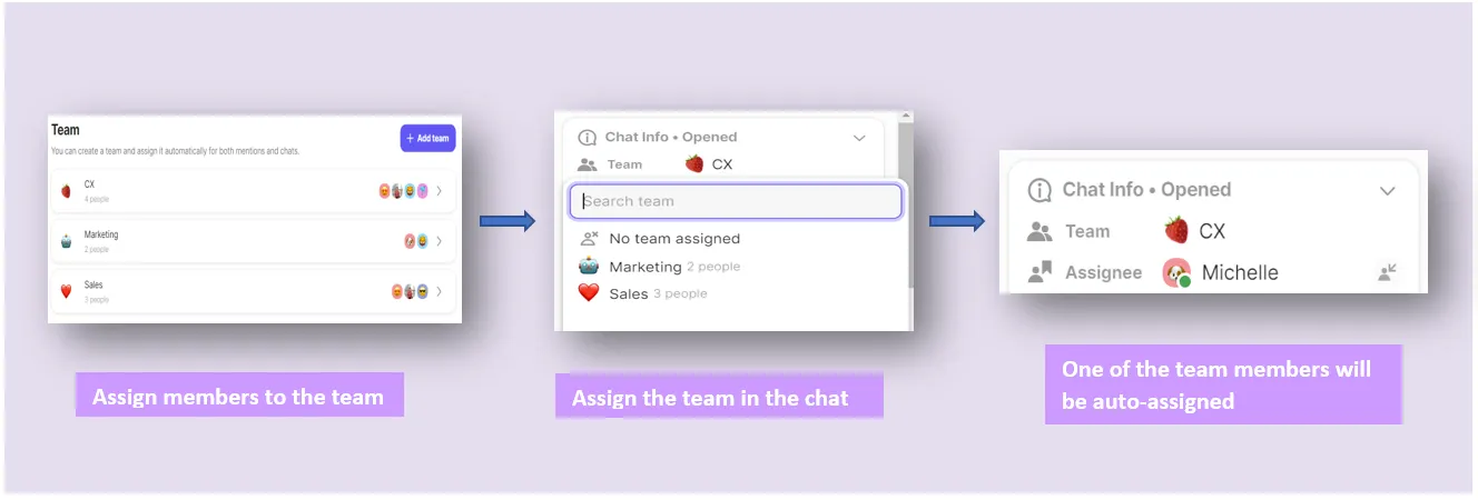 When a new chat comes in, you can manually assign the team who knows best about the customer’s inquiries.
