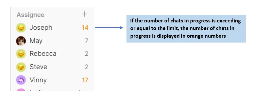 ◦If the number of chats in progress is exceeding or equal to the limit, the number of chats in progress is displayed in orange numbers in the inbox. In this status, the system no longer assigns a new chat, but you can manually assign a new chat by clicking the ‘Assign to me’ button. Or you will still receive new user chats that meet the requirements set by the chat automation rule/support bot action.