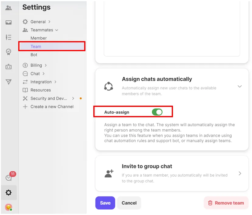 ◦How to set: [Channel settings > Teammates > Team > Assign chats automatically]