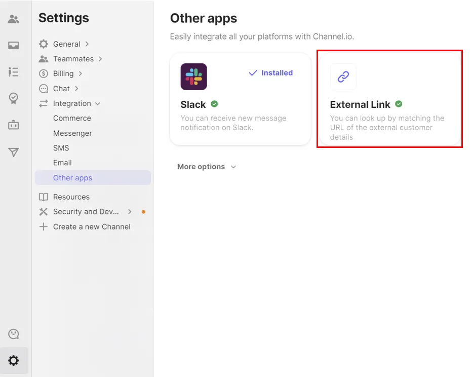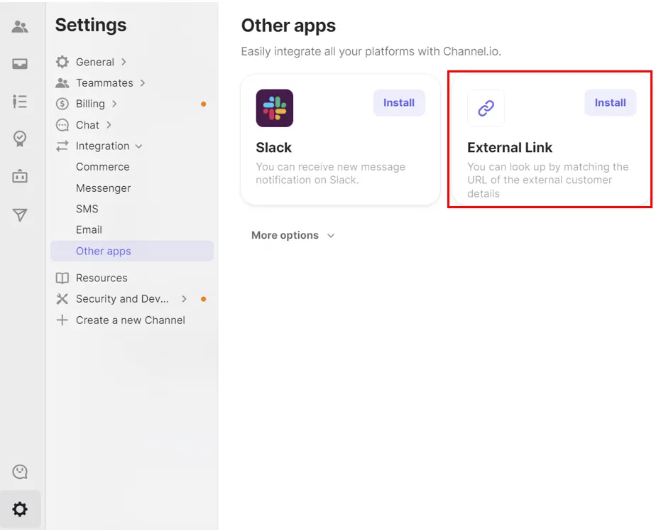 In [Channel settings] → [Integration] → [Other apps], click the [Install] button on the External Link box.