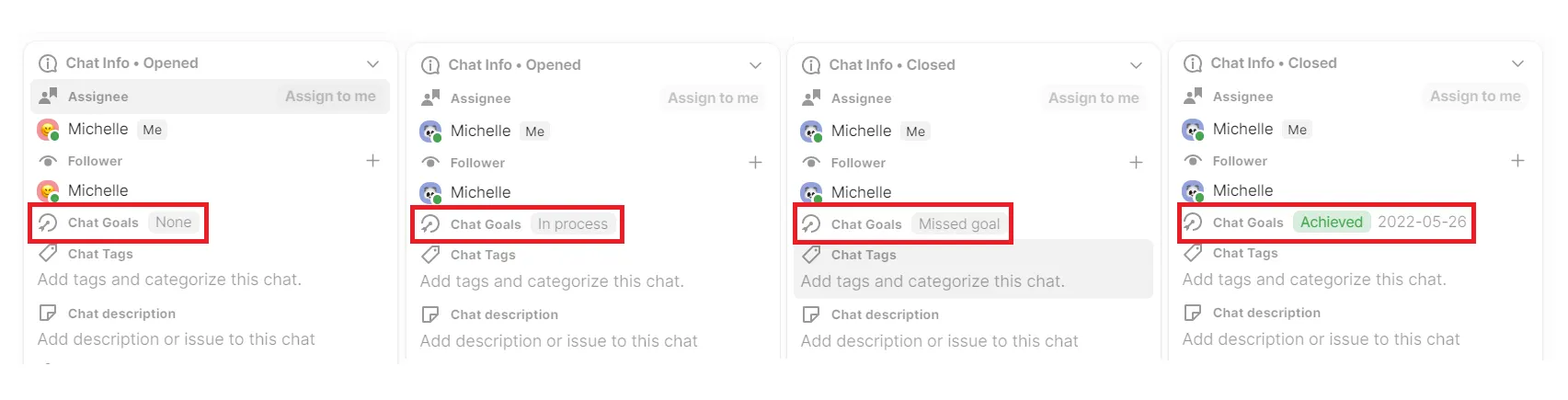 Once the chat goal is achieved, the status will be updated to [achieved] status. When a closed chat is reopened and if the goal has changed at the time of reopening, the system will analyze the goal achievement based on the current chat goal once again. Based on current goal setting, the goal status will be updated accordingly.