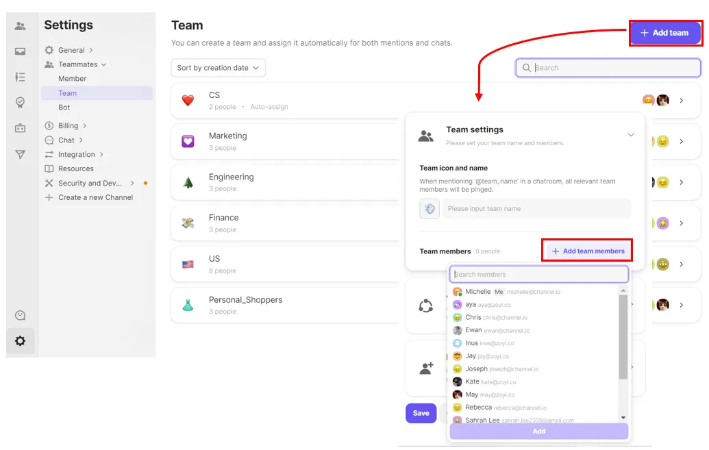 Now that you have invited all your team members onto your channel, its time to now set them into their teams!. Marketing, Sales, Design, Spanish language, any team you need you can make and add new team members! The team function is useful for both team chat and user chats to get the perfect conversations going.