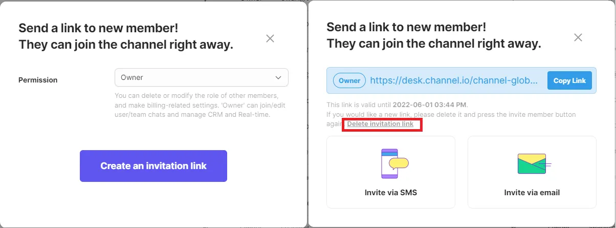 An Owner can directly invite a new member to the channel by creating an individual invite link. After creating the [Invite Link], you can invite your team members in three separate ways: