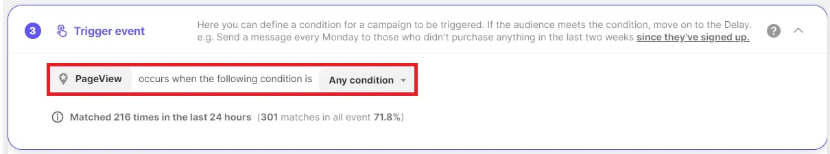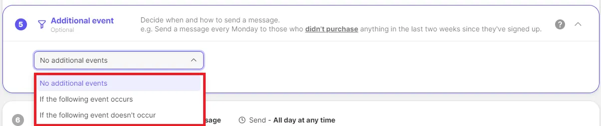 By using the additional event filter, you can send a message if there is no purchase within 1 day after placing an order, or send a message if a purchase is made within 3 days of viewing page A.