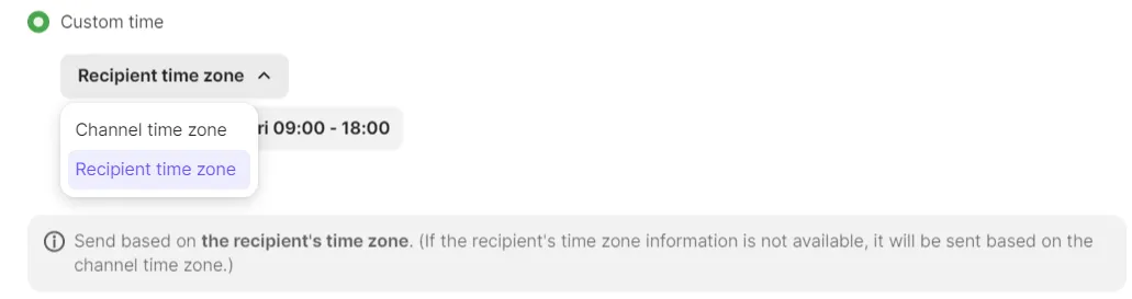 'Recipient time zone' - The message will be sent out based on the recipient’s time zone. If there is no recipient’s time zone information, the message will be sent out based on the channel time zone. If the recipient's time has passed the scheduled delivery time, the message won’t be delivered.