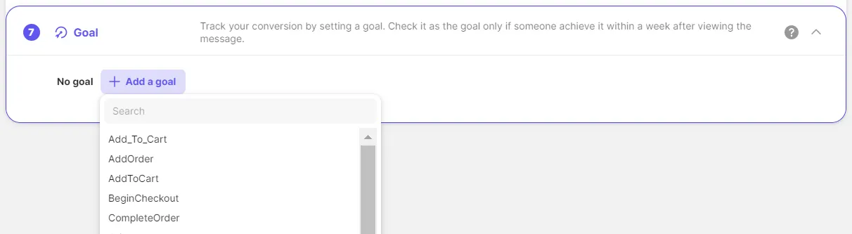 Set goals to measure the conversion rate of the message you send. When a customer who receives the message visits the website and completes the event you set, it is measured as a goal achieved.