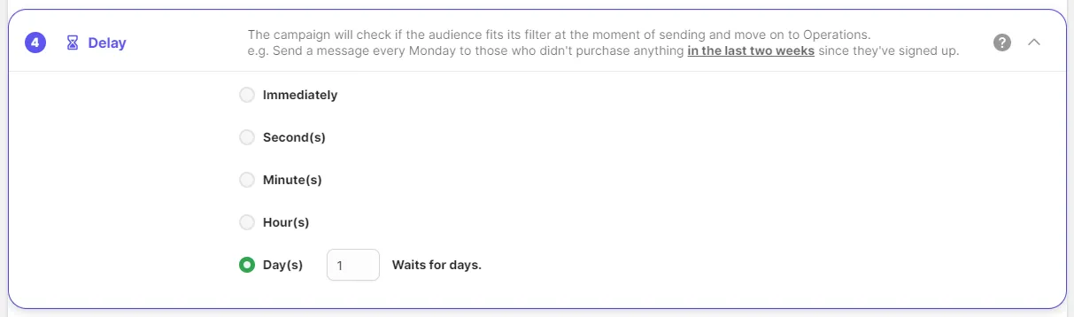E.g.) Send a message every Monday at 9am if the customer hasn’t purchased anything for 2 weeks after signing up.