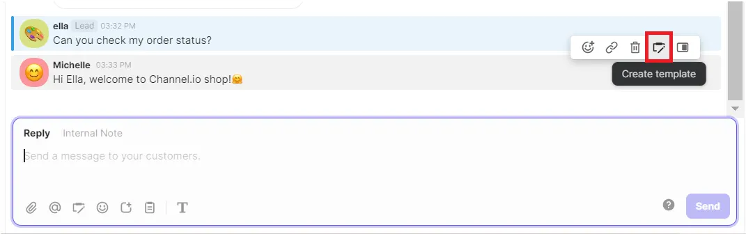 If you are in the middle of a customer chat, and there is a message which you would like to save as a template, hover your mouse over the message and click the [create template] button.