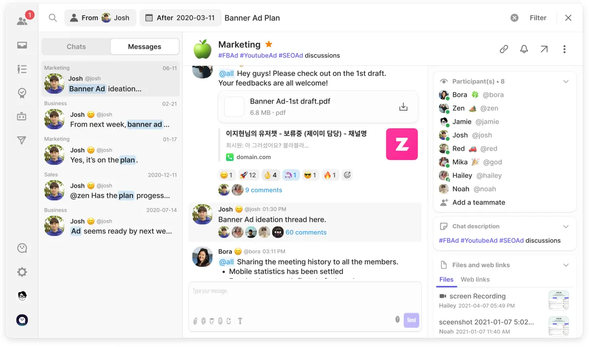 Team chat saves every message, file, and link. You can find the shared files in any chat at anytime with a simple click on the dashboard, all you need to do is search and filter to find the files you are looking for.