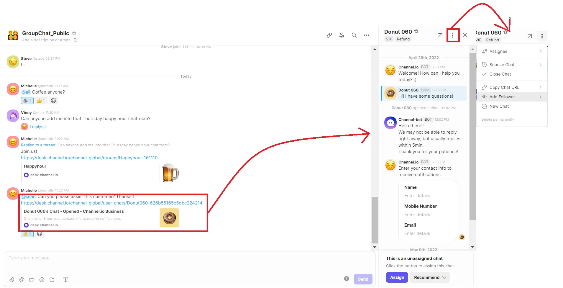 You can even send messages directly through side view. Through the [•••]setting button you can change status, assign an operator to user chats, or even add follows to a chat.