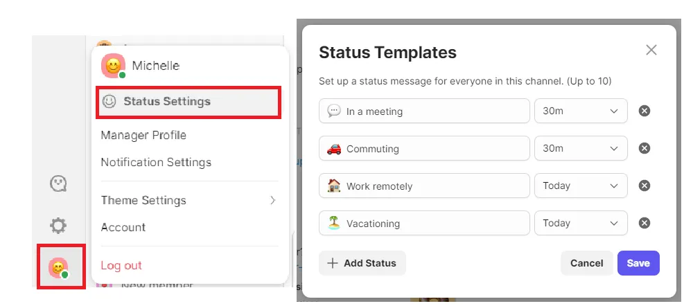 On your profile, you can change your current status and communicate to your team exactly what you are doing.