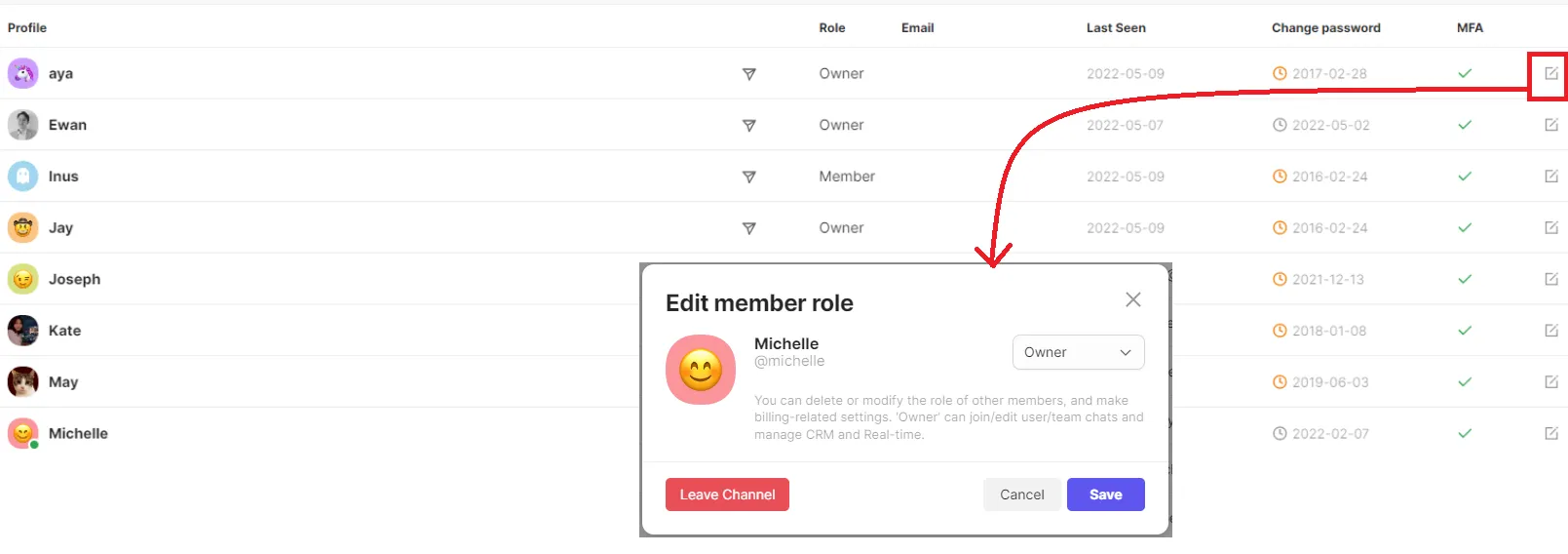 [Channel settings] → [Teammates] → [Members] → [+Edit member role button]