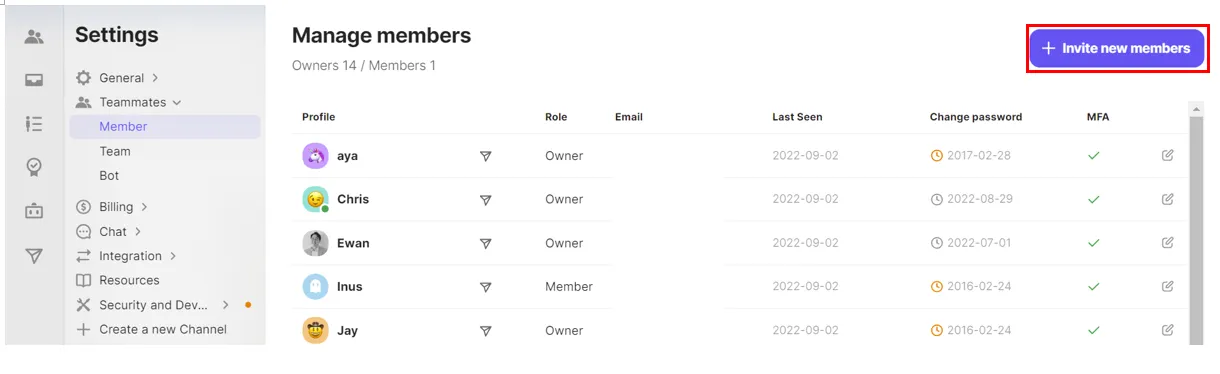[channel settings] → [teammates] → [members] → [+Invite new member]