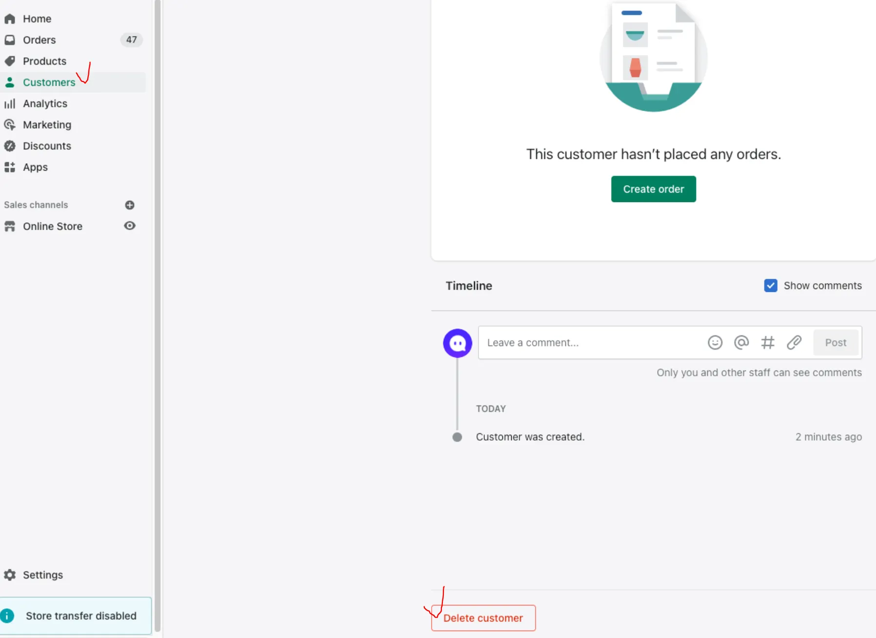 delete: deletes the customer account. The customer profile is removed and cannot be restored.