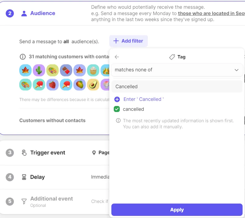 When sending marketing messages, you can select to exclude customers with the ‘Cancelled user’ tag on the ‘Audience’ tab.