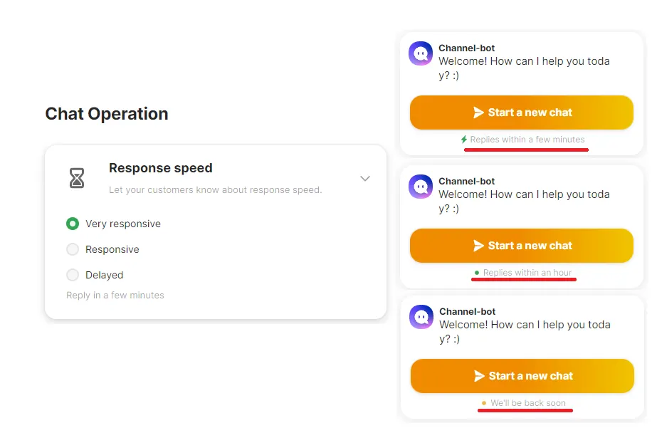 During operating hours, customers see average response times. When you are out of office (non-operating hours), customers will be notified when the next operating hours begin.