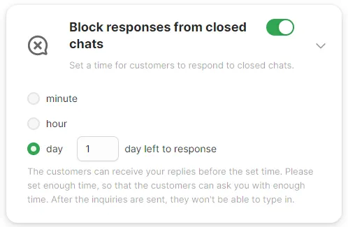 Given that the customer may have any remaining inquiries, you can set the waiting period for at least 1 minute since the chat was closed. Even if this time elapses the chatting window does not close until the customer leaves.