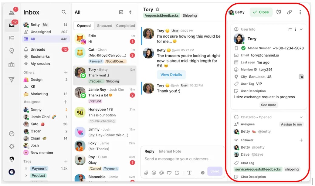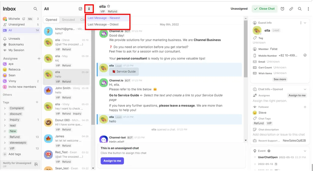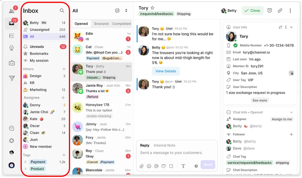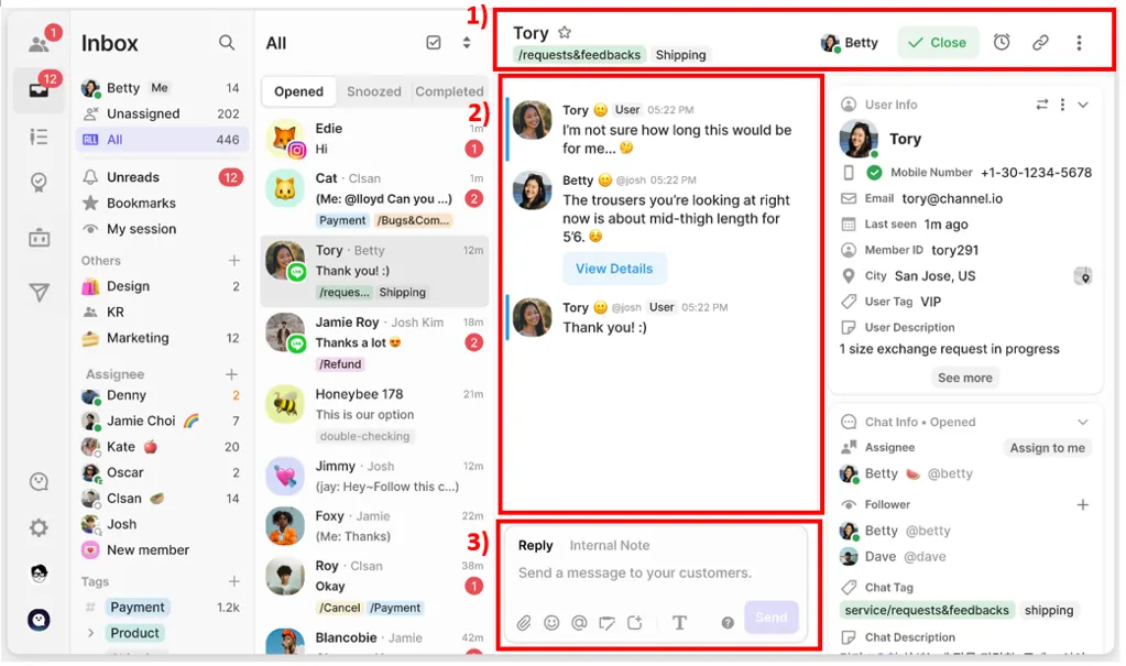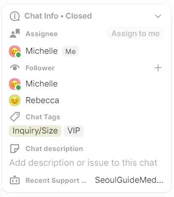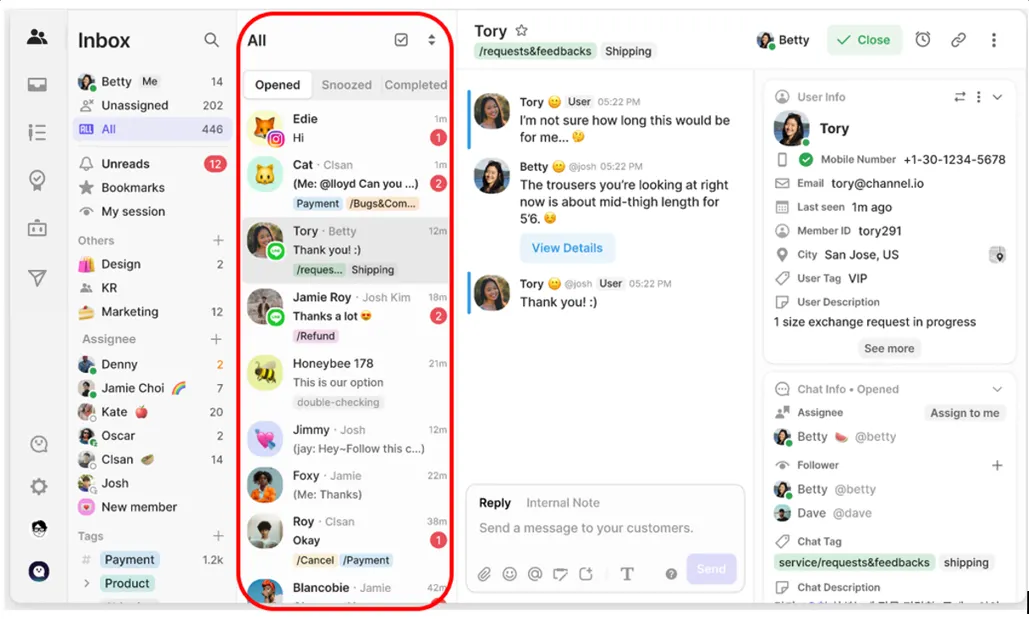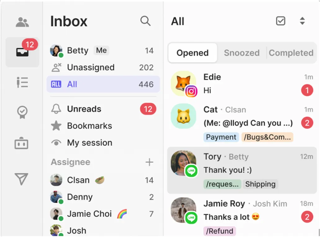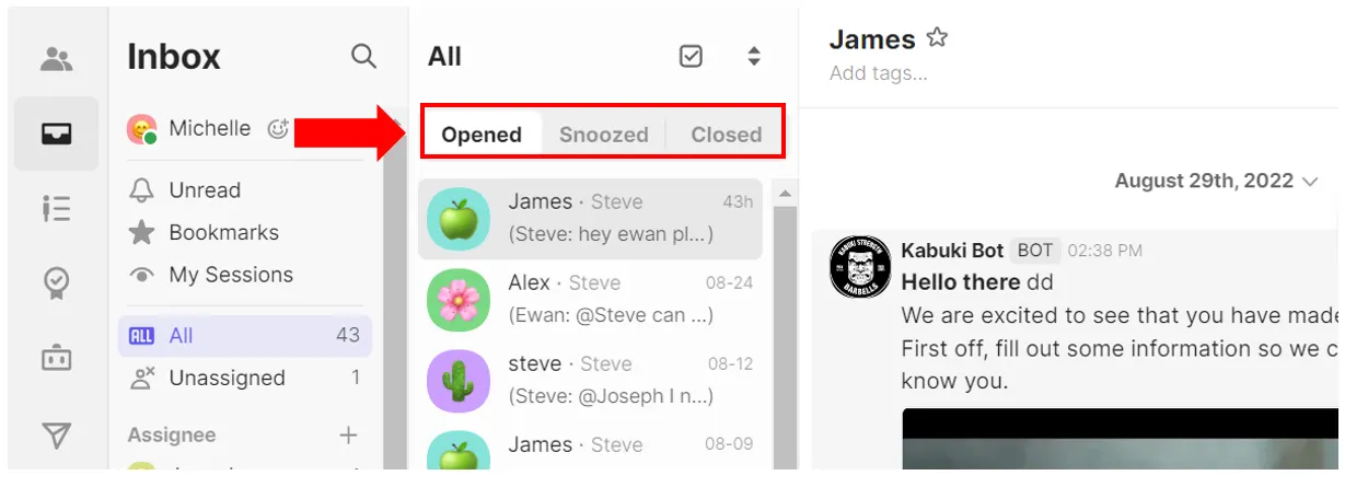 You can easily check the chat list by status by clicking the [Opened], [Snoozed], and [Closed] tabs. When the status of a chat changes, it automatically moves to the list of the changed status. Here you can view information such as a customer name, the ‘Assignee’ of each chat, chat tag, and date of the last received message – all in one glance.