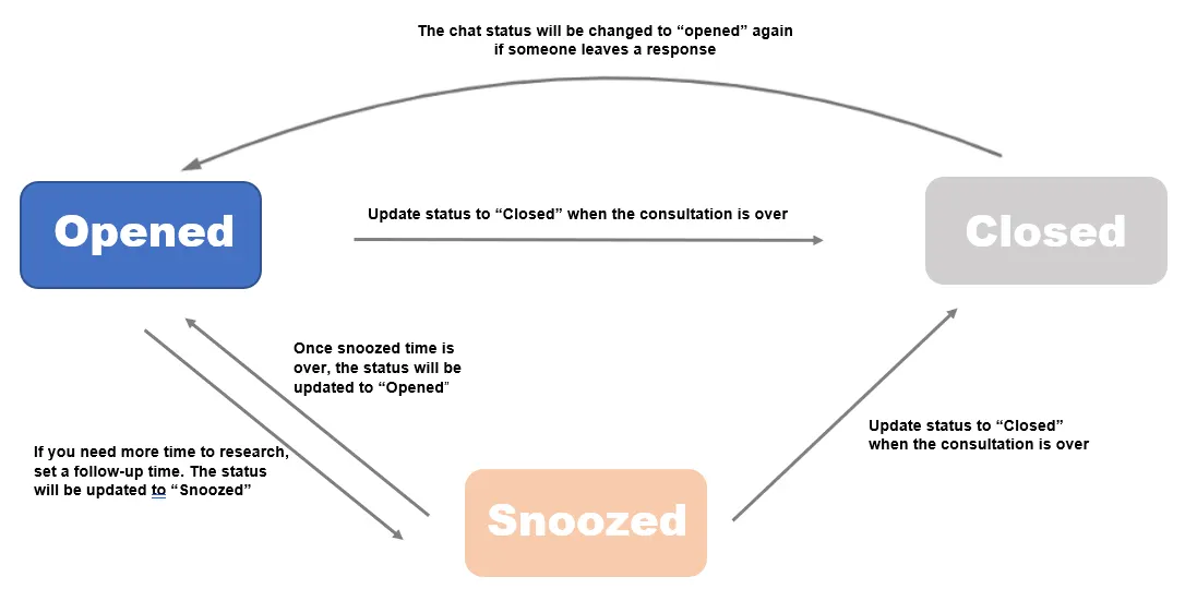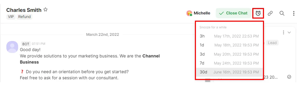Chats that can’t be responded to promptly or ended right away can be set to a Snoozed status. When the set time has elapsed, the status automatically changes to ‘Opened’.