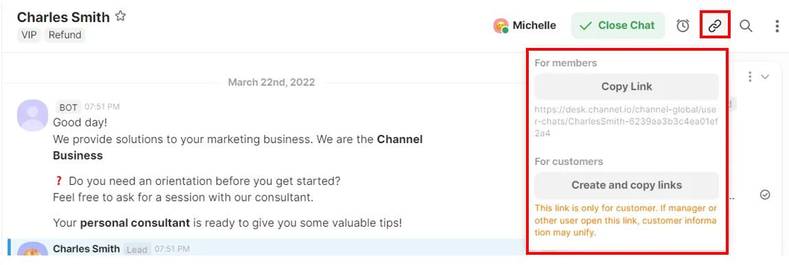 In ‘Chat List’ you can view the list of previous chats you had with the customer.