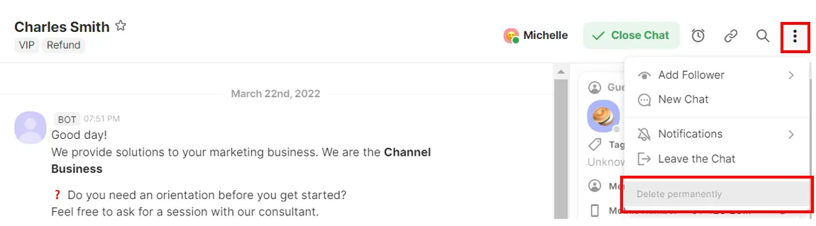 Assign Unassign Edit followers Edit chat tag Send a message Snooze chat Close chat Download data